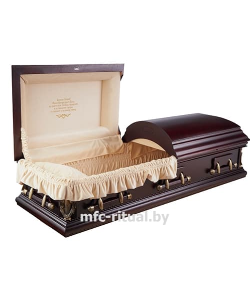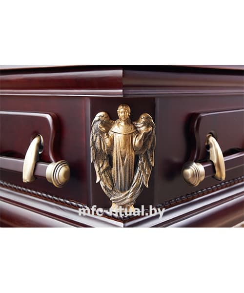 Для изготовления гроба использован массив сосны первого сорта. Дерево высушено до столярной влажности 8 % и отшлифовано. На крышке и в нижней части гроба прикреплена косичка. На углах установлены отлитые бронзовые фигурки ангелов (всего 4 штуки). Гроб окрашен в тёмный цвет и покрыт прозрачным матовым лаком.