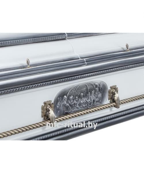 Крышка двойная и может открываться как полностью, так и только со стороны изголовья. Крышка в форме арки с мягкиими закруглениями. На вертикальных стенках находится резной деревянный декор, изображающий библейский сюжет Тайной вечери и христианские символы - кресты и ангелов. Материл изготовления: дерево (сосна) + элементы мдф.